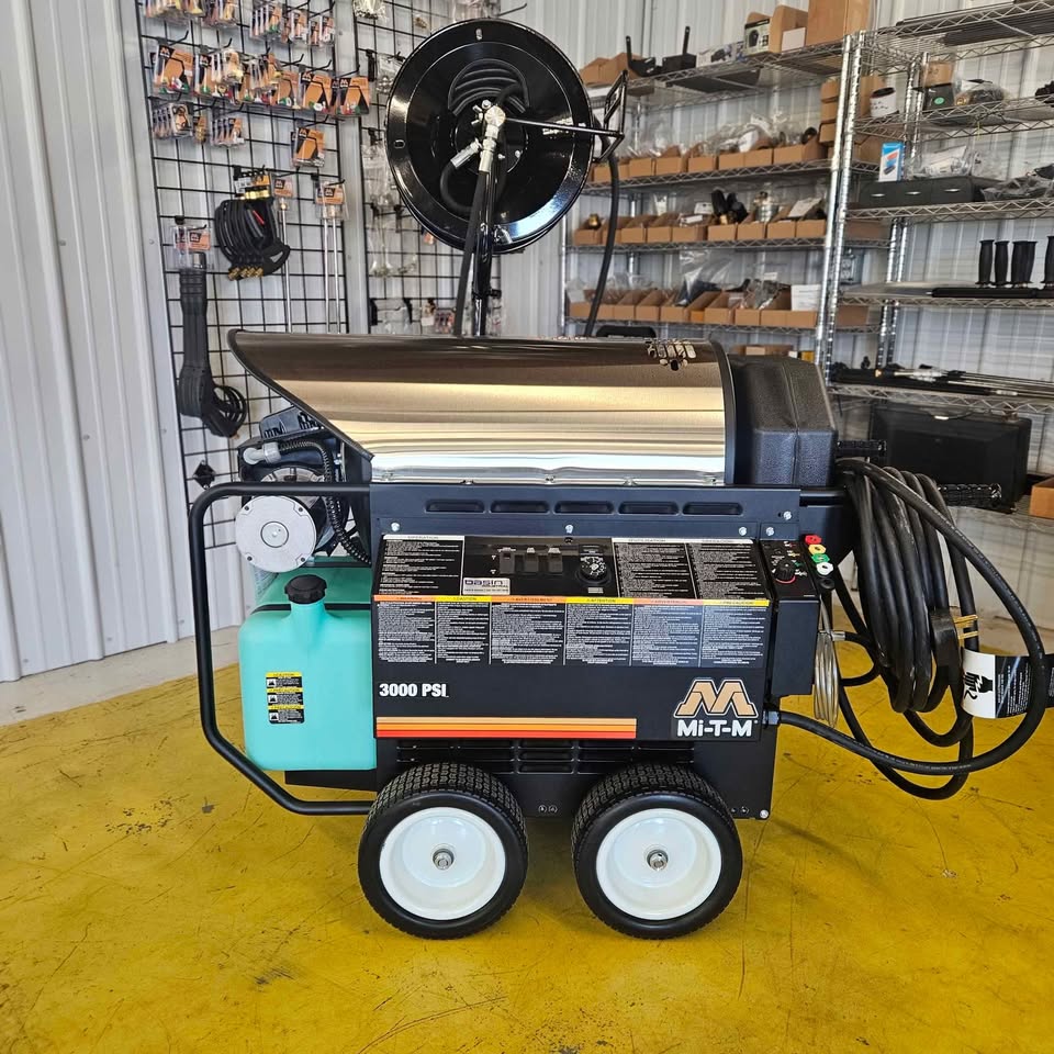 Mi-T-M HHS 3004-2E2G – 220V Electric Powered, Diesel Heated. 3000 PSI at 4 Gallon Per Minute. Our most popular model. $8535 without hose reel $9335 with hose reel and 100′ of hose.